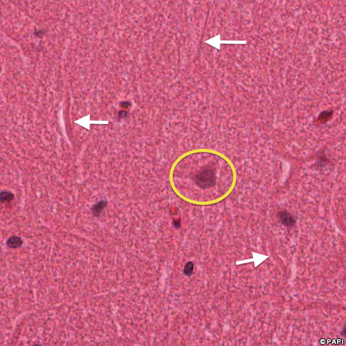 The dendrites of the Purkinje cells are vertically elongated toward the surface of the cerebellelar cortices (arrows). The bascket cell is seen (circle).