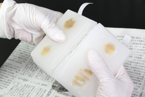 Slightly melt the tissue surface to be attached to the wooden block with an electric soldering iron and then press the tissue onto the wooden block.